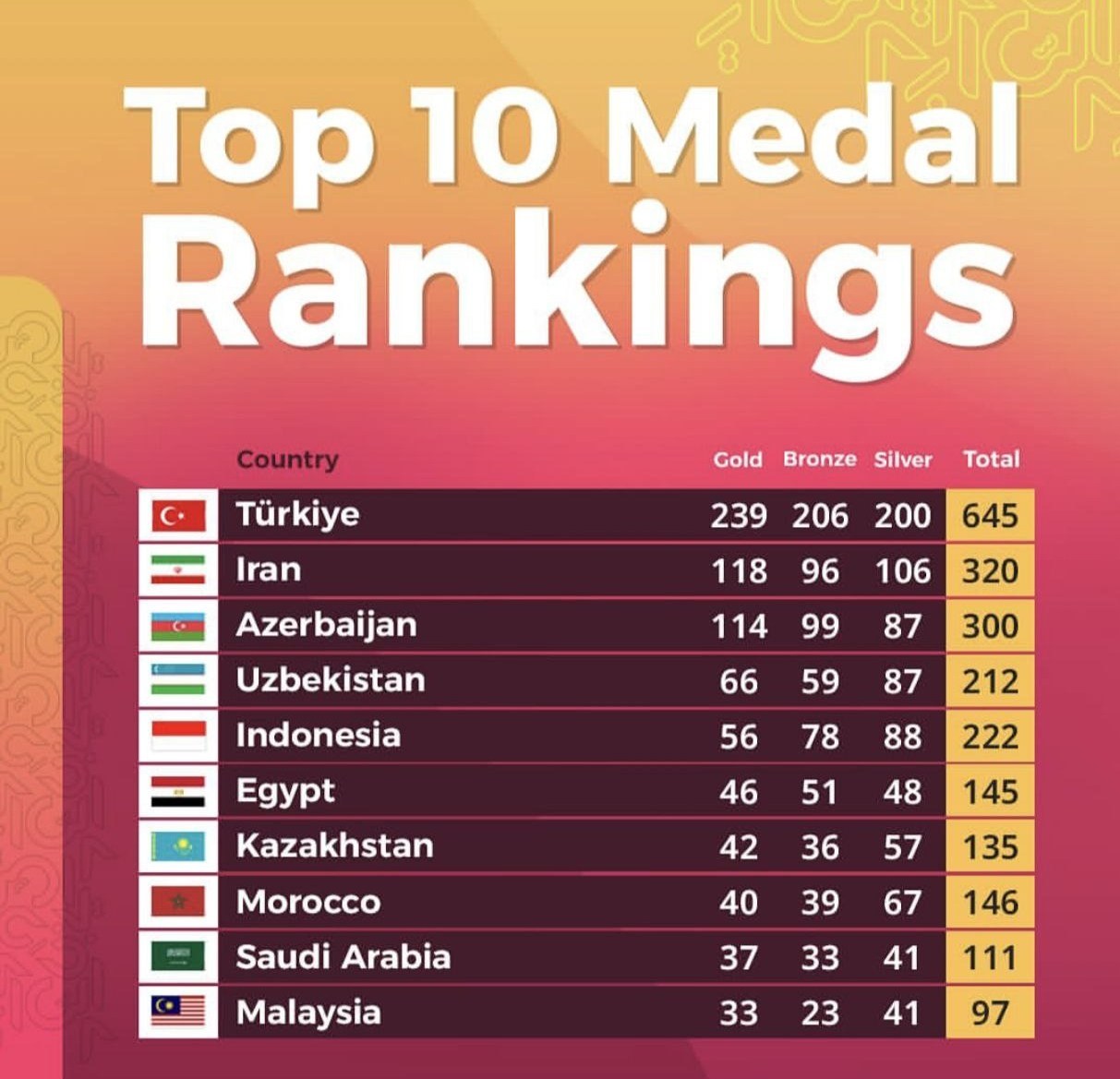 جدول ردهبندی کشورها بر اساس تعداد مدالهای کسب شده در ادوار گذشته بازیهای کشورهای اسلامی به شرح زیر است: