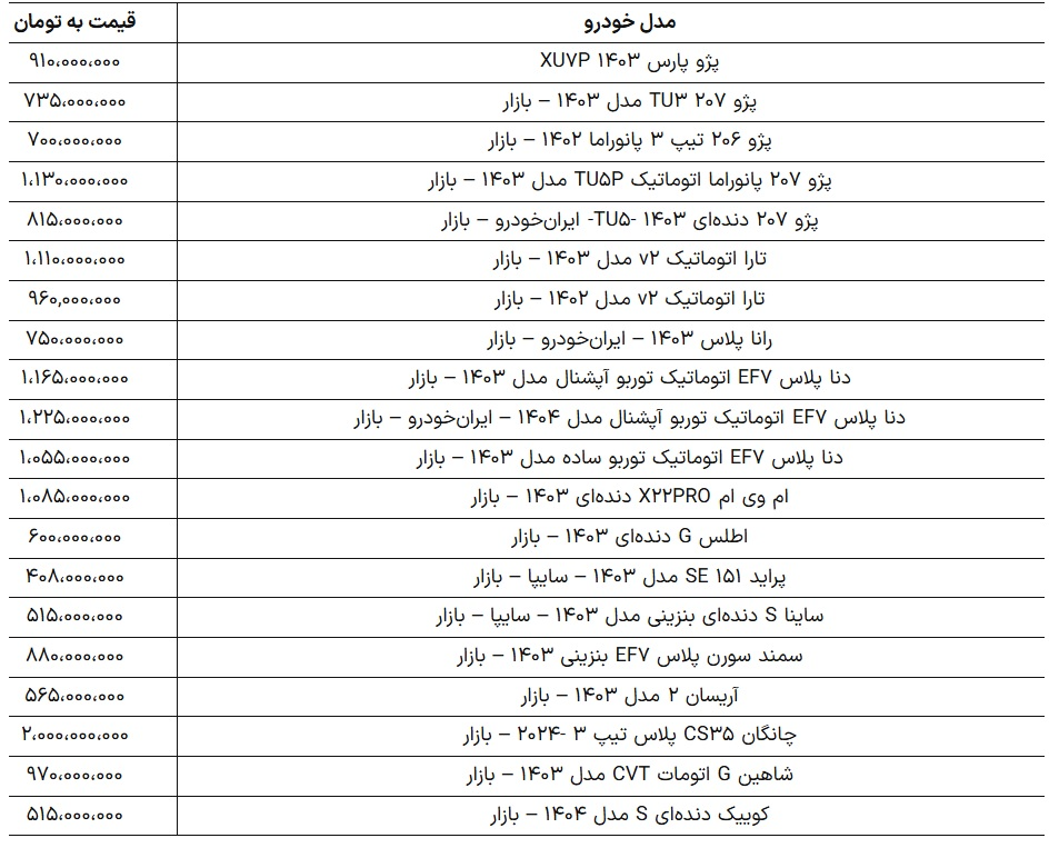 قیمت خودرو در بازار آزاد جمعه ۲۰ تیر ماه