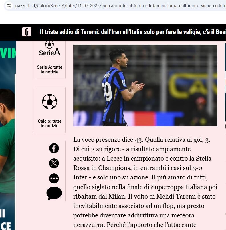 چهره مهدی طارمی اکنون به عنوان یک «ناکام» در ذهن هواداران اینتر نقش بسته و حتی ممکن است دوران حضور او در تیم نراتزوری خیلی زود به پایان برسد و به یک «پدیده گذرا» (meteora) بدل شود. زیرا نقشی که مهاجم ایرانی در تیم ایفا کرده بسیار کمتر از حد انتظاری بوده که پس از سالهای موفقش در پورتو وجود داشت.