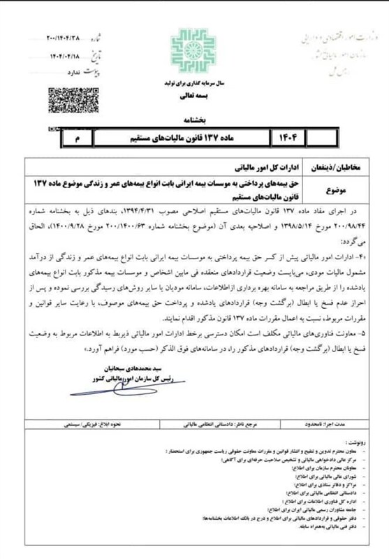 این بخشنامه که با استناد به ماده 137 قانون مالیاتهای مستقیم صادر شده است، بر لزوم نظارت دقیقتر و بررسی وضعیت قراردادهای بیمهای پیش از کسر مالیات تاکید دارد.