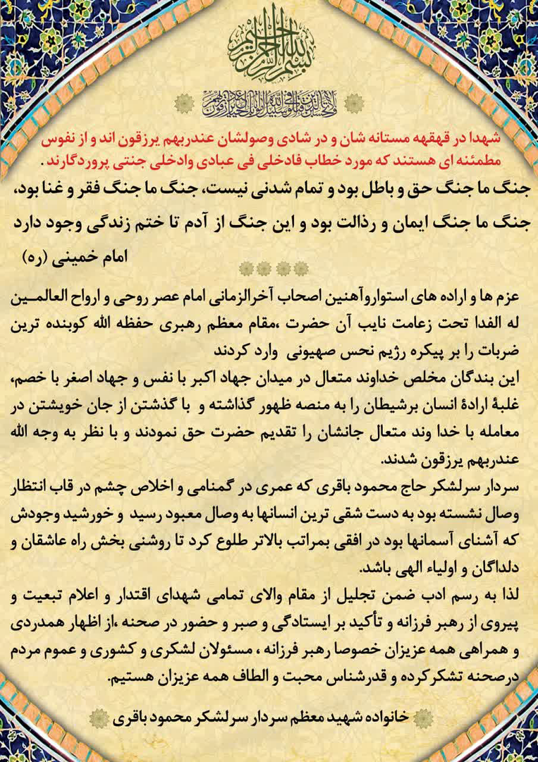 خانواده سرلشکر پاسدار محمود باقری فرمانده شهید موشکی نیروی هوافضای سپاه پاسداران انقلاب اسلامی در پیامی از رهبر معظم انقلاب تشکر و از حضور ملت ایران در مراسمهای بزرگداشت و تشییع پیکر شهدای اقتدار تشکر و قدردانی کردند.
