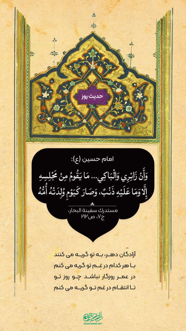 و زائر و گریه کننده من... از جایش برنخیزد مگر اینکه گناهی بر او نیست، و مانند روزی میشود که مادرش او را به دنیا آورده است..