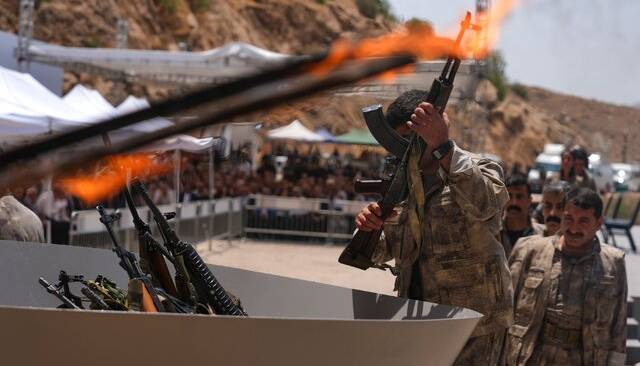 اعضای حزب کارگران کردستان (پ.ک.ک) در مراسمی در منطقه کردستان عراق، دو ماه پس از اعلام پایان چهار دهه درگیری مسلحانه توسط اعضای کرد علیه دولت ترکیه، سلاحهای خود را زمین گذاشتند.
