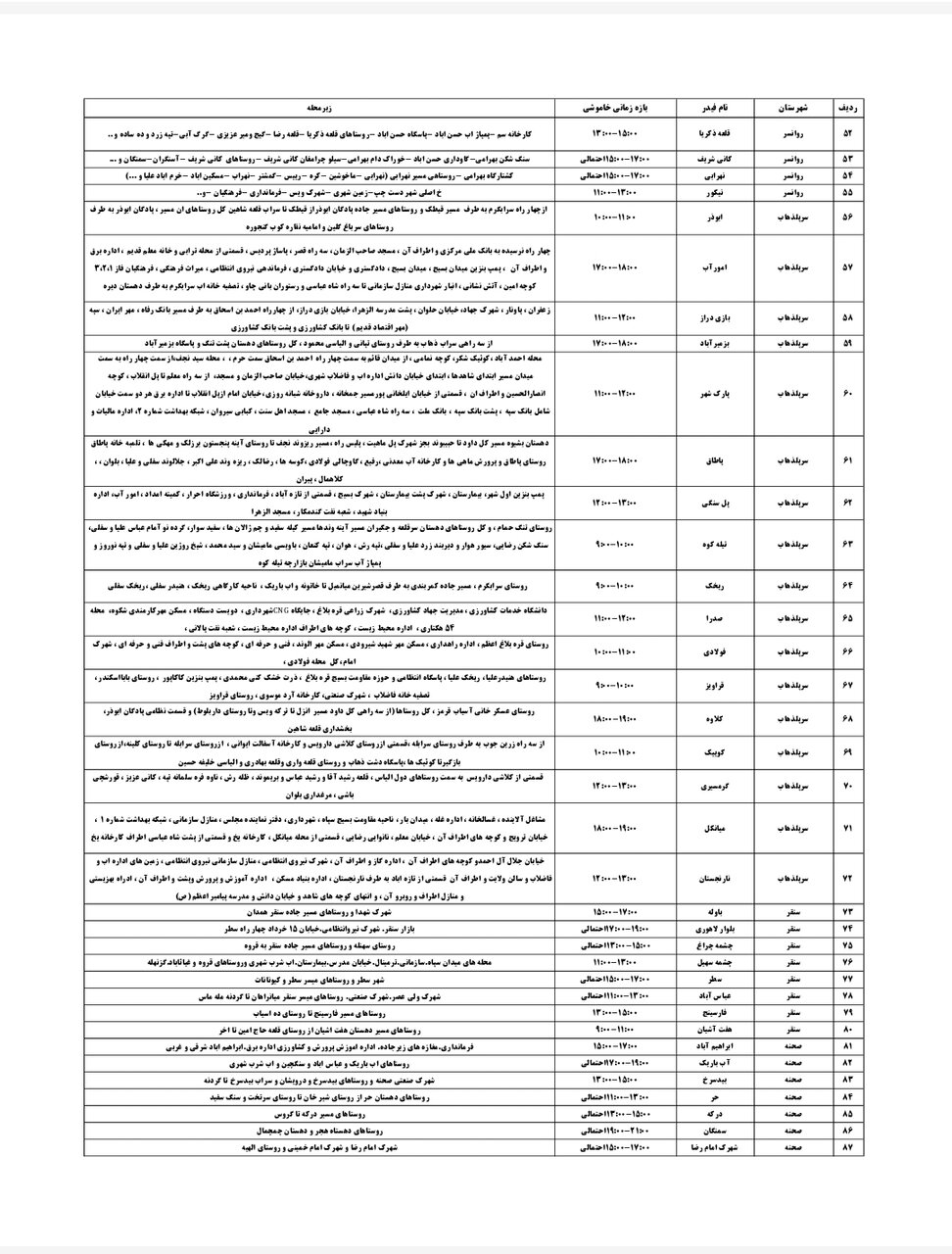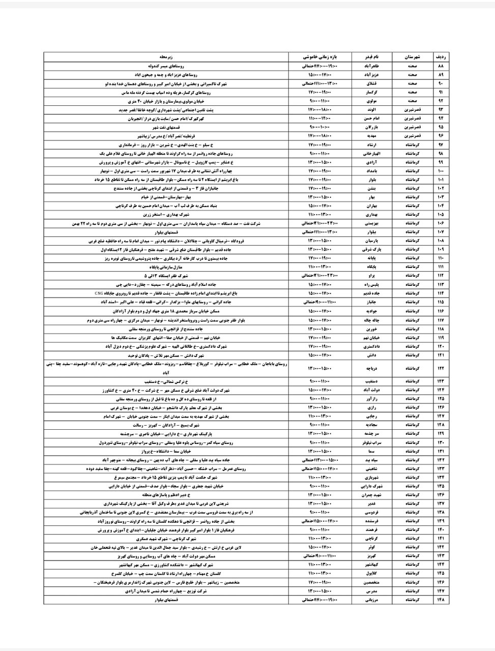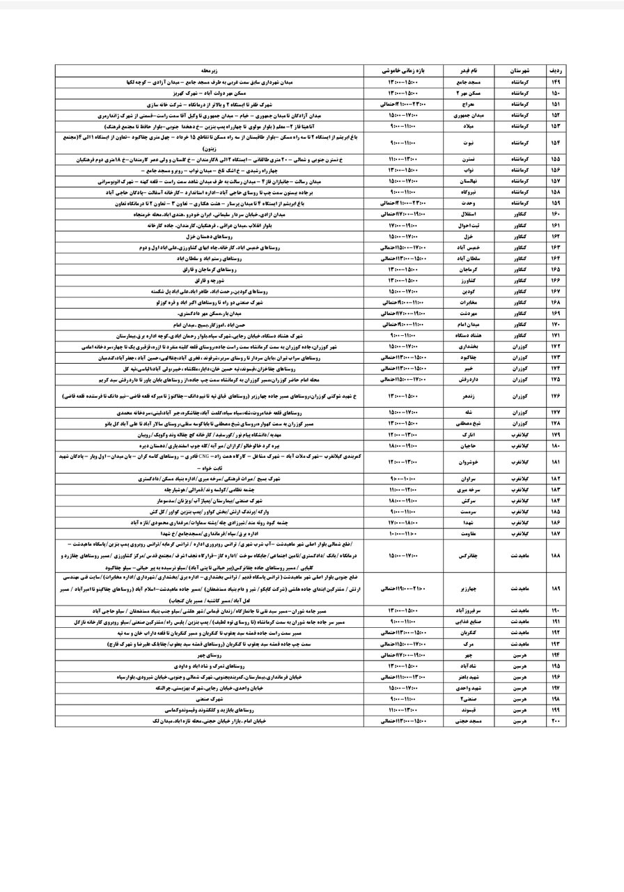 شرکت توزیع برق استان کرمانشاه طی جدولی، زمانبندی قطعی برق در مناطق مختلف استان کرمانشاه را برای امروز _یکشنبه بیستودوم تیر_ اعلام کرد.
