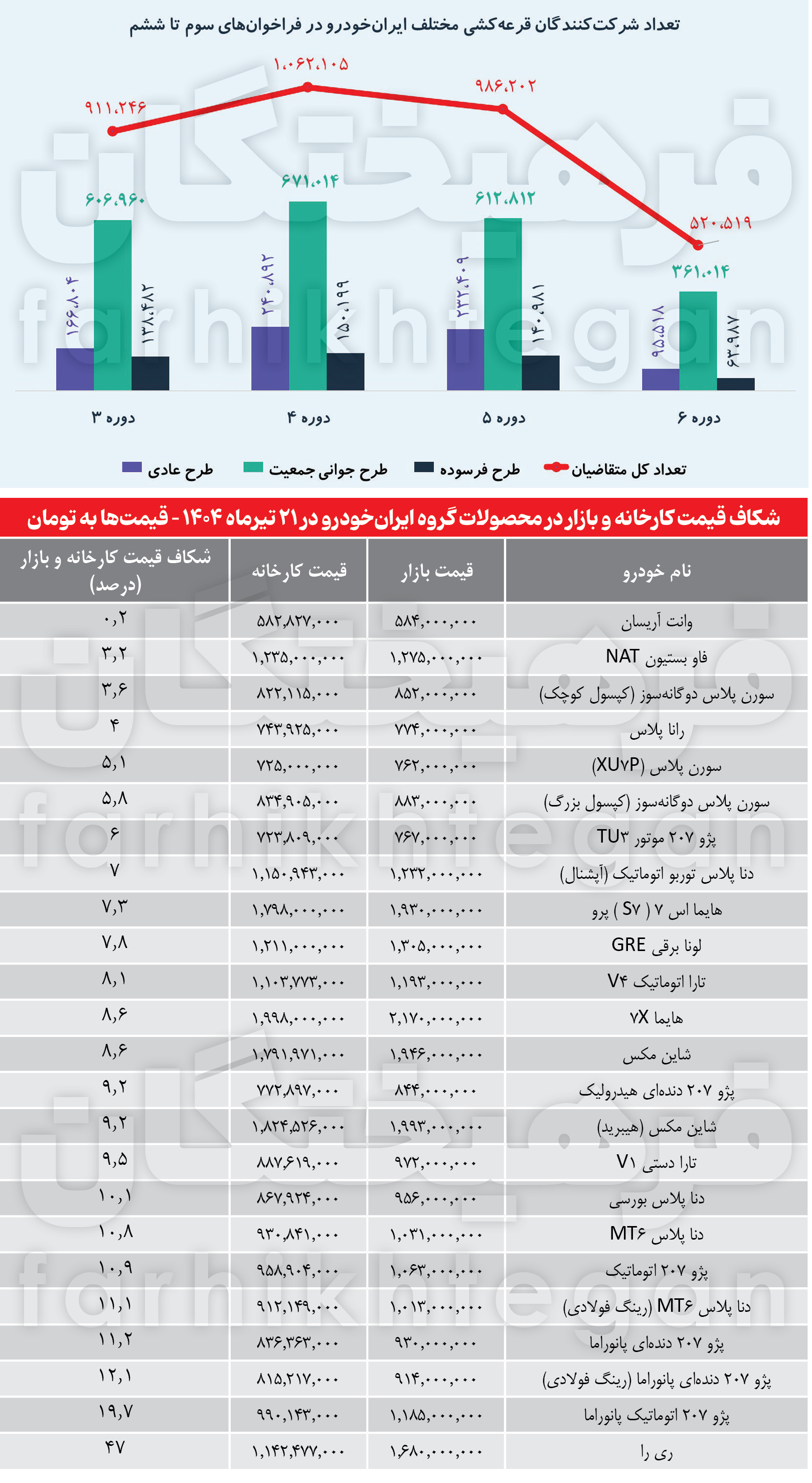 نزدیک ۱۰ میلیون نفر ثبتنام کردند و برای خرید خودرو صف کشیدند؛ اما گذشت زمان و تغییر شرایط، اوضاع را تغییر داد. حالا در تیرماه 1404، تعداد متقاضیان قرعهکشی خودروهای گروه ایرانخودرو به زحمت تا 520 هزار و 500 نفر هزار نفر میرسد. این درحالی است که بررسیهای «فرهیختگان» نشان میدهد در مرحله پنجم که در اردیبهشت سال جاری، دو و نیم ماه قبل برگزار شد، تعداد شرکتکنندگان بیش از 986 هزار نفر بوده است. به عبارتی، تعداد شرکتکنندگان قرعهکشی اخیر ایرانخودرو نسبت به قرعهکشی دو ماه قبل کاهش بیش از 47 درصدی داشته است. اگر عدد دوره ششم را با دوره چهارم مقایسه کنیم، حدود 542 هزار نفر از تعداد شرکتکنندگان قرعهکشی در کمتر از چند ماه قید شرکت در قرعهکشی ایرانخودرو را زدهاند. به نظر میرسد یکی از مهمترین دلایل این سقوط 50 درصدی شرکتکنندگان در قرعهکشی ایرانخودرو، از بین رفتن شکاف قیمت کارخانه و بازار بوده است که با دو بار تعدیل قیمت از انتهای آبان 1403 تاکنون انجام شده است. دادهها نیز نشان میدهد در برخی خودروهای اقتصادی گروه ایرانخودرو شکاف قیمت کارخانه و بازار بعضا به زیر یک و حتی نیم درصد رسیده است. همچنین در 70 درصد از خودروهای گروه ایرانخودرو شکاف قیمت بازار و کارخانه به طور میانگین 6 درصد است، شکافی که با خواب چندماهه (3 تا 6 ماه) پول شرکتکنندگان در قرعهکشی عملاً سود یا رانت چندانی را عاید خریدار نکرده و منجر به خروج خریداران سرمایهای و همچنین سفتهبازان از فرایند قرعهکشی خودرو میکند.