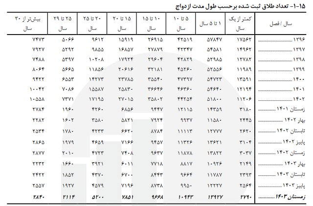 در بخش دیگری از این گزارش بر تعداد طلاق ثبت شده بر حسب طول مدت ازدواج نیز اشاره شده است.