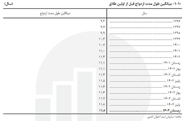 طبق آنچه از وضعیت اجتماعی و فرهنگی ایران از سوی مرکز آمار ایران اعلام شده، میانگین طول مدت ازدواج قبل از اولین طلاق در زمستان سال گذشته به ۱۱.۸ سال رسید که نسبت به پاییز سال ۱۴۰۳ تغییر نکرده است. این درحالی است که نسبت به زمستان سال ۱۴۰۲، ۰.۲ درصد افزایش پیدا کرده است.