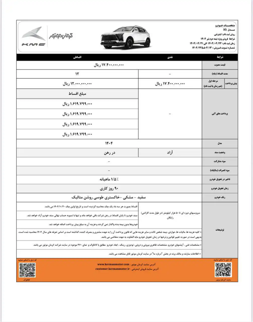 شرکت کرمان موتور شرایط فروش کراس اوور مونتاژی خود را به صورت نقد و اقساط ویژه تیر ماه ۱۴۰۴ اعلام کرد. در این شرایط فروش کراس اوور کی ام سی X5 به صورت فروش فوری با تحویل ۹۰ روز کاری عرضه خواهد شد. کرمان موتور شرکت مونتاژ کنند KMC X5 قیمت قطعی این خودرو را ۱,۷۴۰,۰۰۰,۰۰۰ تومان اعلام کرده است. در شرایط اقساطی متقاضیان می توانند با پیش پرداخت ۱,۲۰۰,۰۰۰,۰۰۰ و اقساطی به مدت ۱۲ ماه در این شرایط فروش ثبت نام کنند. اقساط محاسبه شده برای این خودرو هر ۳ ماه یک فقره چک به مبلغ ۱۶۱,۹۷۹,۹۰۰ تومان است. KMC X5 کراس اوور جک و سهول بر اساس جک S5 است که توسط کرمان موتور به بازار ایران عرضه می شود. جک S5 یکی پرفروش ترین کراس اوورهای بازار ایران در سال های اخیر بود. متقاضیان می توانند از روز دوشنبه ۲۳ تیرماه تا روز سه شنبه ۳۱ تیرماه با مراجعه به سایت کرمان موتور نسبت به ثبت نام در این شرایط فروش اقدام نمایند.
