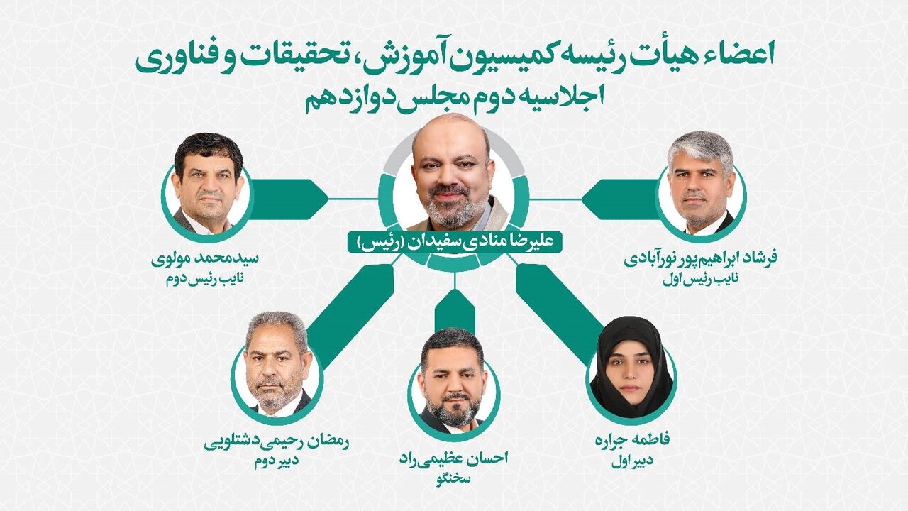 علیرضا منادی سفیدان نمایندهٔ تبریز، آذرشهر و اسکو به عنوان رئیس کمیسیون آموزش، همچنین فرشاد ابراهیم پور نورآبادی نماینده ایذه، باغملک، دزپارت و صیدون و سیدمحمد مولوی نماینده آبادان به عنوان نواب اول و دوم ، فاطمه جراره نماینده بندرعباس، قشم، ابوموسی، حاجیآباد و خمیر و رمضان رحیمی دشتلویی نماینده فلاورجان به عنوان دبیران اول و دوم و همچنین احسان عظیمی راد نماینده مشهد و کلات سخنگوی کمیسیون آموزش و تحقیقات مجلس شورای اسلامی انتخاب شدند.