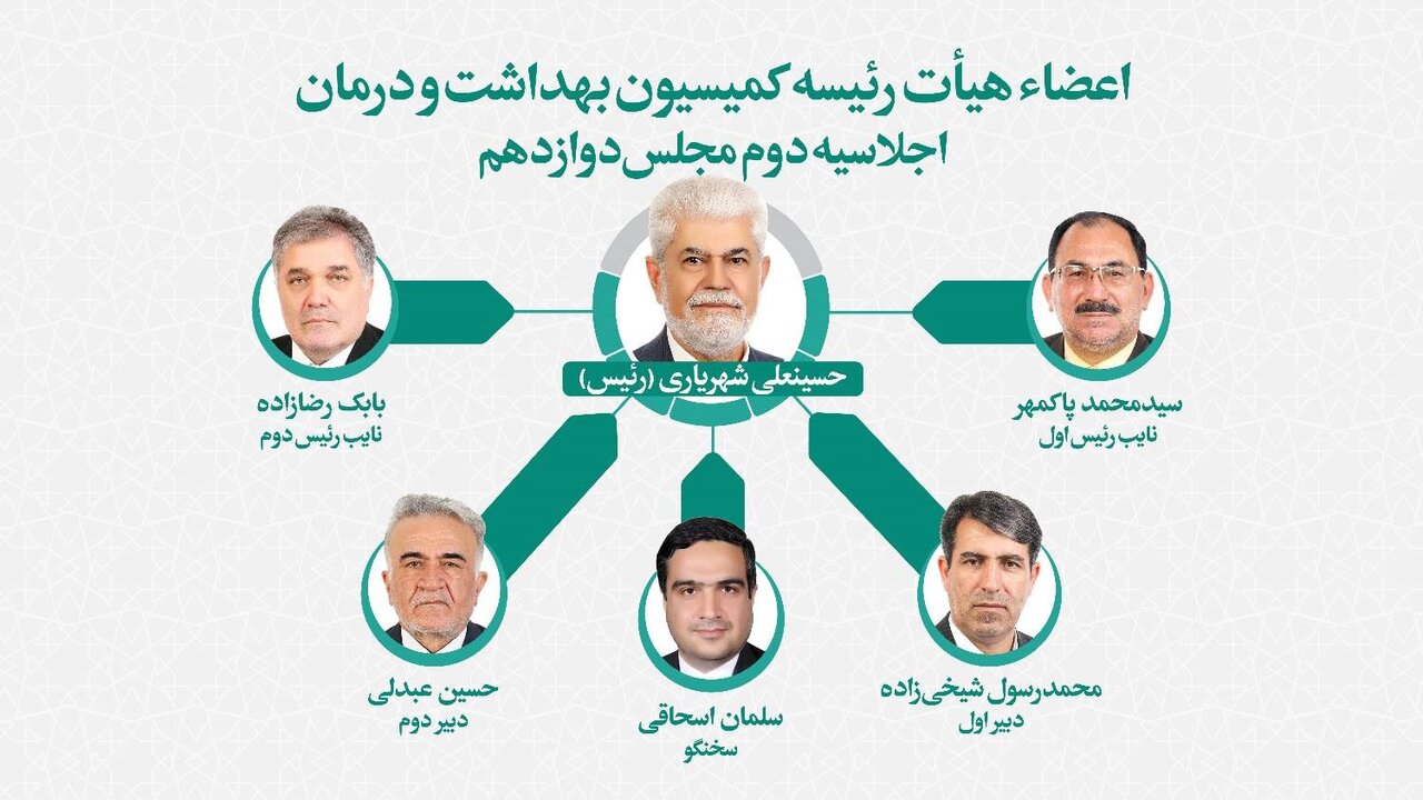 حسینعلی شهریاری نماینده مردم زاهدان برای دومین سال به عنوان رئیس کمیسیون بهداشت و سید محمد پاکمهر نماینده مردم بجنورد و بابک رضازاده نماینده مردم مشکین شهر به ترتیب به عنوان نواب اول و دوم انتخاب شدند.