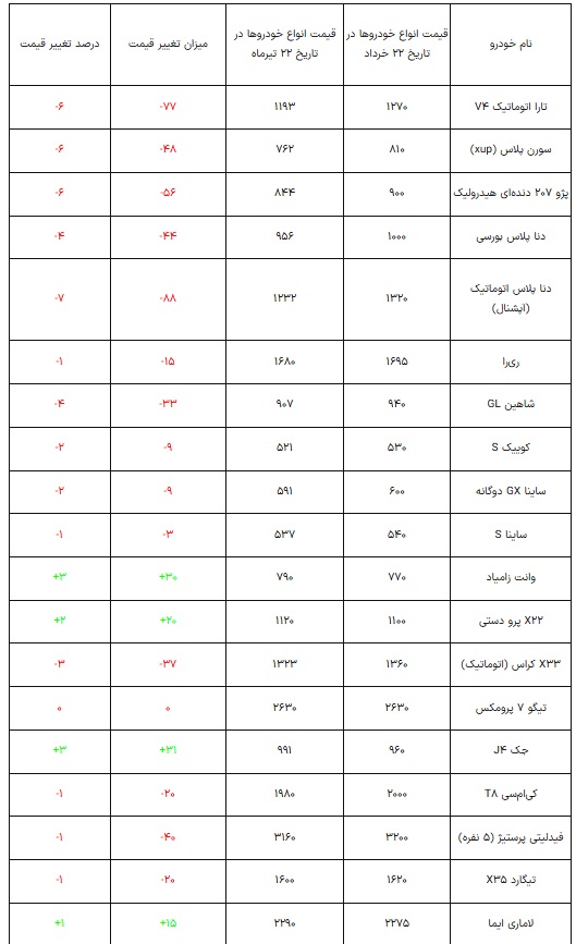 در ادامه قیمت انواع خودروها در دوبازه زمانی 22 خرداد و 22 تیرماه بررسی شده است.