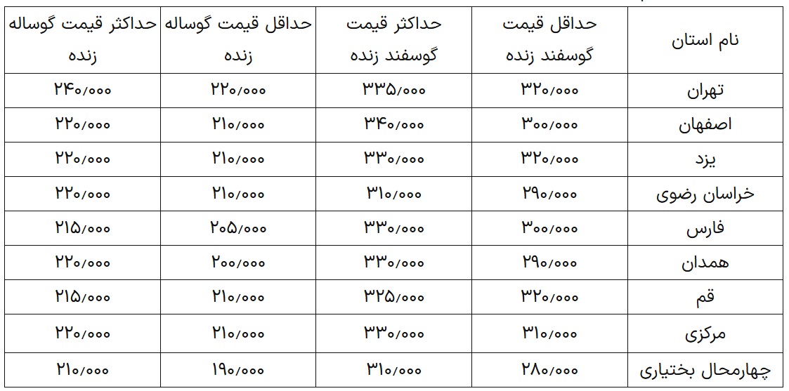 جدول زیر قیمت دام زنده را در استانهای مختلف کشور نشان میدهد.