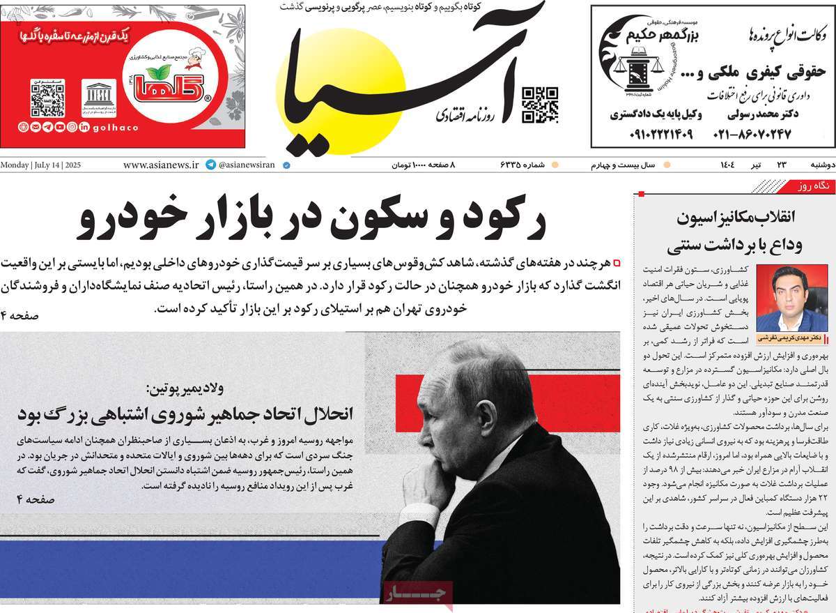 صفحه اول روزنامه آسیا دوشنبه ۲۳ تیر