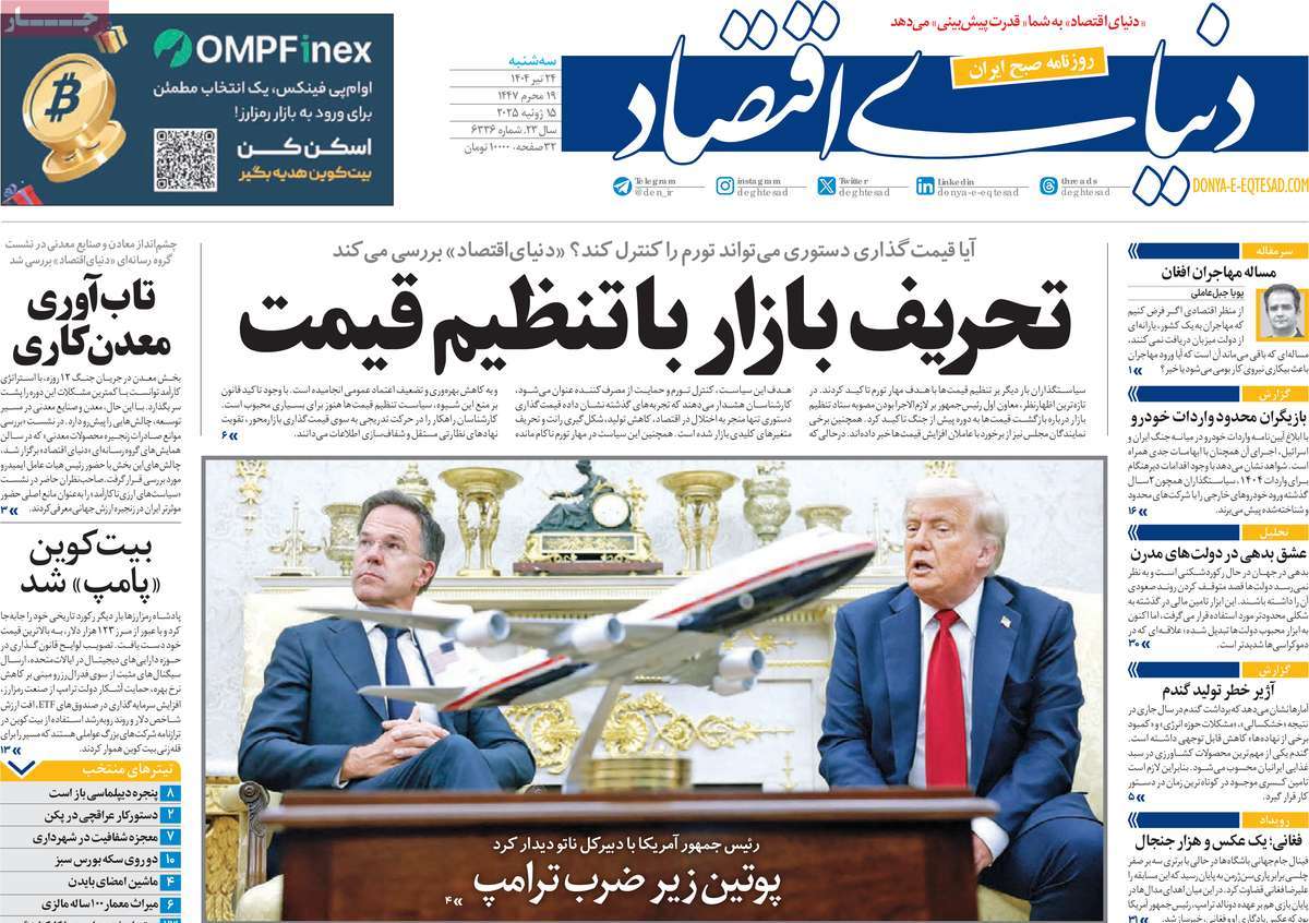 صفحه اول روزنامه دنیای اقتصاد سه‌شنبه ۲۴ تیر