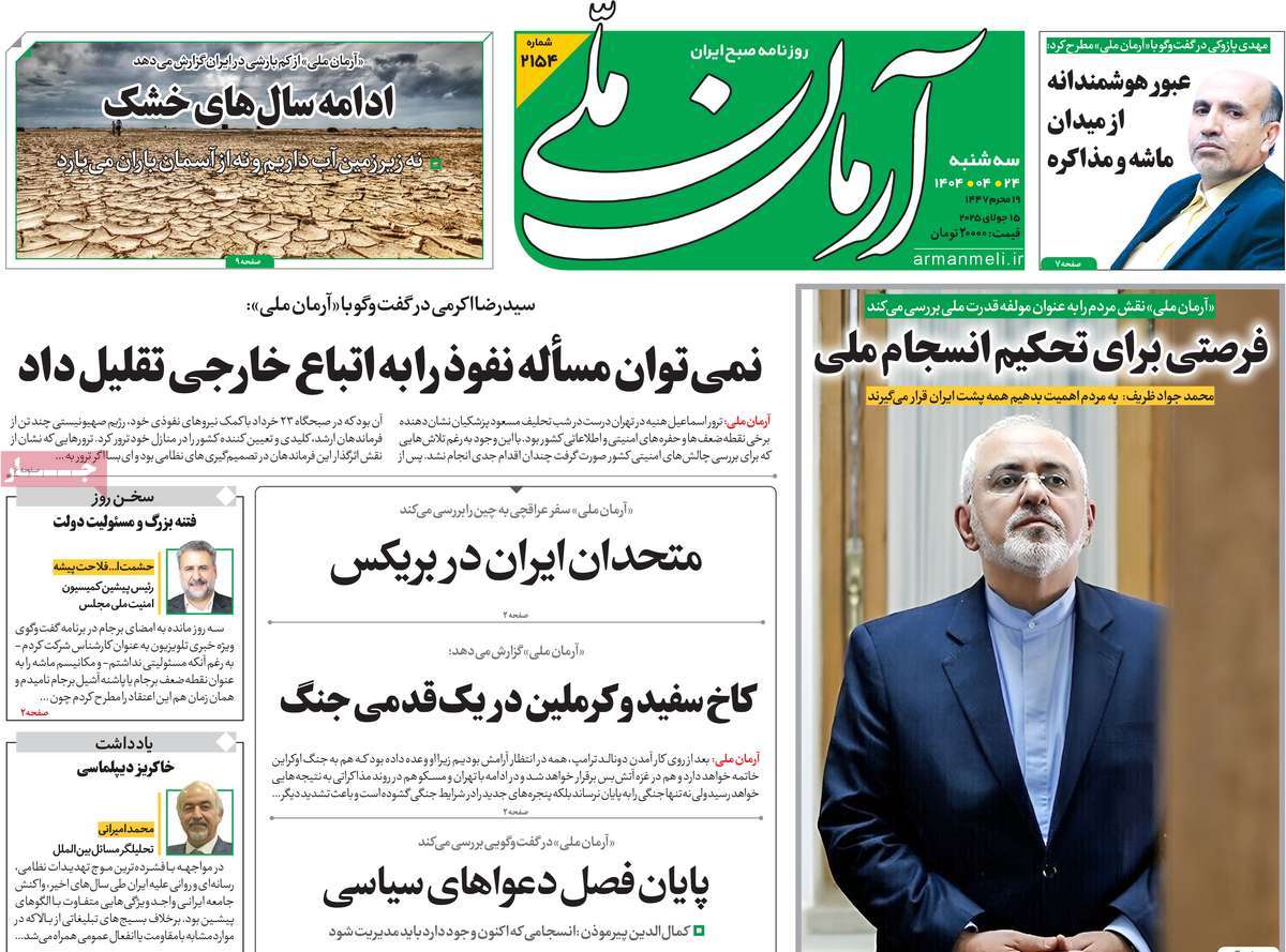 صفحه اول روزنامه آرمان ملی سه‌شنبه ۲۴ تیر