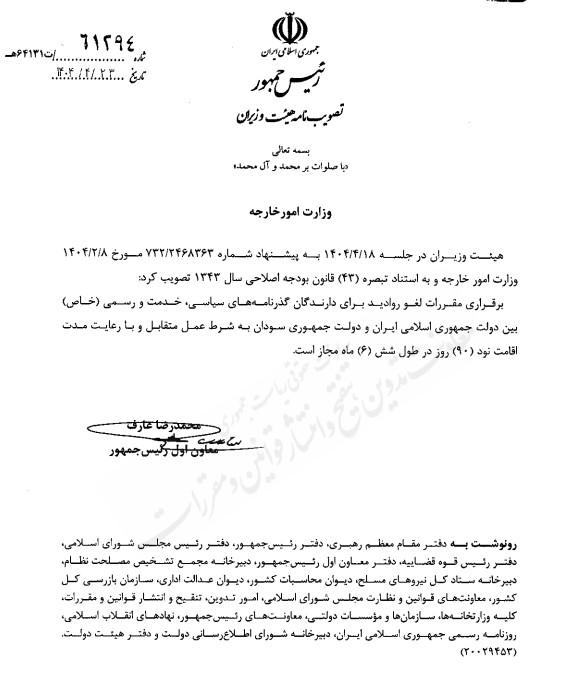 تصویبنامه مصوب جلسه مورخ ۱۴۰۴/۰۴/۱۸ هیئت وزیران در خصوص «مجاز بودن برقراری مقررات لغو روادید برای دارندگان گذرنامههای سیاسی، خدمت و رسمی (خاص) بین دولت جمهوری اسلامی ایران و دولت جمهوری سودان» با شماره ۶۱۲۹۴ در تاریخ ۱۴۰۴/۰۴/۲۳ توسط معاون اول رئیس جمهور ابلاغ شد.