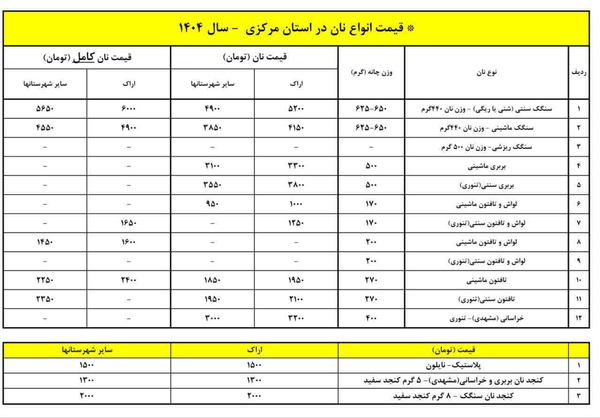 قیمت جدید انواع نان در استان مرکزی اعلام شد.