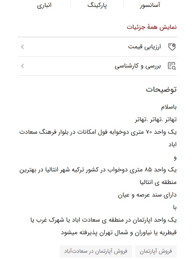 یا اینکه مالک آپارتمان ۴۰۰ متری لوکس واقع در سعادت آباد اعلام کرده است که ملک خود را با دو واحد کوچک تر در مناطق مرکزی تهران و یا به صورت اینکه بخشی از پول را به صورت نقد و بخشی دیگر را با خودرو تهاتر کند حاضر است بفروشد.