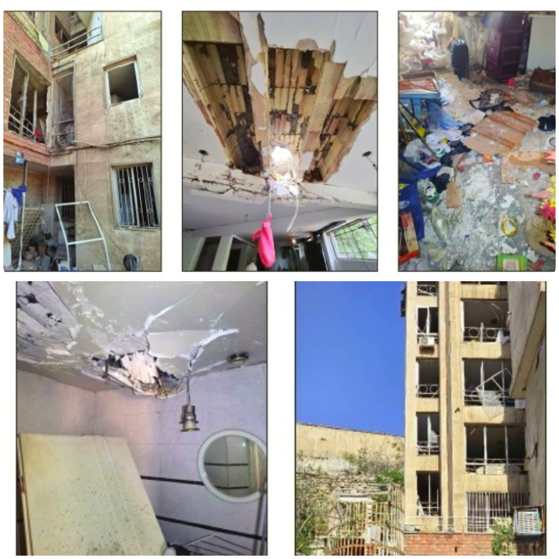 طبقه اول، واحد ۱۰۳ نزدیکترین خانه به محل حمله بیشترین آسیب را در بین واحدهای دیگر دیده است. دربهای اتاقها و سرویسهای بهداشتی به طور کامل تخریب شدهاند، ترکشهای انفجار روی تمام در و دیوار خانه پخش شده و گچبریها ریخته است. درپوشهای کانالهای کولر از جا درآمده و سقف حمام و دستشویی سوراخ شده است. تقریبا از وسایل خانه چیزی باقی نمانده و همه در هم دیگر خورد شده است. صاحبخانه میگوید، تلاش کرده با کمک کارگران، بخشی از خرده شیشهها و چوبهای در هم تنیده را از کف خانه جمع کند اما هنوز هم راه رفتن به سختی ممکن است. شرایط خانه زمانی وخیمتر میشود که تراس خانه را میبینیم. سوراخی به اندازه یک راکت، سقف تراس ۷۰ متری خانه را شکافته و تا پارکینگ فرو رفته است. اهالی ساختمان میگویند، جزو راکتهای عمل نشده بوده که بعد از حمله آن را خارج کردهاند. اهالی خانه زمان حمله حضور نداشتند، نمیدانم اگر بودند با این حجم از تخریب اصلا کسی زنده میماند؟ قفلی که به در ساختمان زندهاند تا امنیت خانه را تا حدی تامین کنند، چند روز بعد به دست دزدان با فرز برقی بریده شده و واحدها بارها در شرایطی که سیم دوربین ساختمان بریده شده مورد سرقت قرار گرفته است.