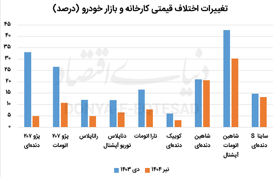 کمترین اختلاف قیمت بین کارخانه و بازار ثبت شده بین 10 خودروی مورد بررسی نیز به کوییک دندهای میرسد این محصول سایپا در بازار 520 میلیون تومان و در کارخانه 505میلیون تومان قیمتگذاری شده تا اختلاف قیمت تنها 15 میلیون تومانی و سه درصدی را ثبت کند. این در شرایطی است که در دی ماه سال 1403 این رقم 26میلیون تومان و 6 درصد بود. راناپلاس و پژو 207 دندهای نیز هرکدام 4.8درصد در بازار گرانتر از کارخانه فروخته میشوند. پژو 207 دندهای در کارخانه بهایی معادل 773میلیون تومان و در بازار قیمت 810 میلیون تومانی دارد، بنابراین اختلاف قیمت آن 37 میلیون تومان است. این خودرو در میانه زمستان سال گذشته 615 میلیون تومان قیمت رسمی داشت اما در بازار 820 میلیون تومان خرید و فروش میشد و اختلاف قیمتی مذکور برای آن به 205 میلیون تومان و 33درصد میرسید. راناپلاس سال گذشته در بازار 73 میلیون تومان و 12 درصد گرانتر از کارخانه بود حالا به اختلاف قیمتی 4.8 درصدی رسیده و درحالی در کارخانه 744 میلیون تومان فروخته میشود که بهای بازار آزاد آن 780 میلیون تومان است. مابقی خودروها نیز اختلاف قیمتی 6.4 تا 10.7 درصدی را ثبت کردهاند.
