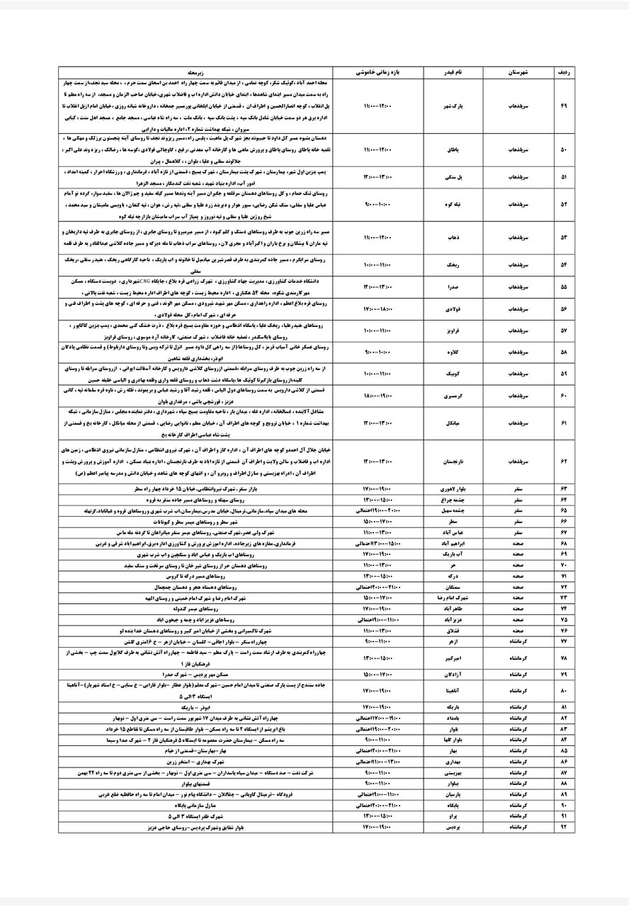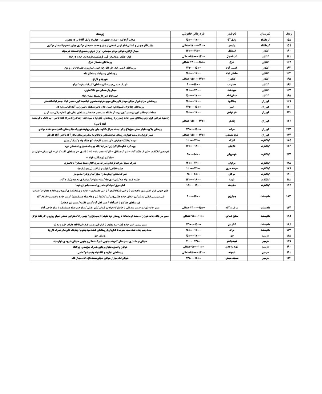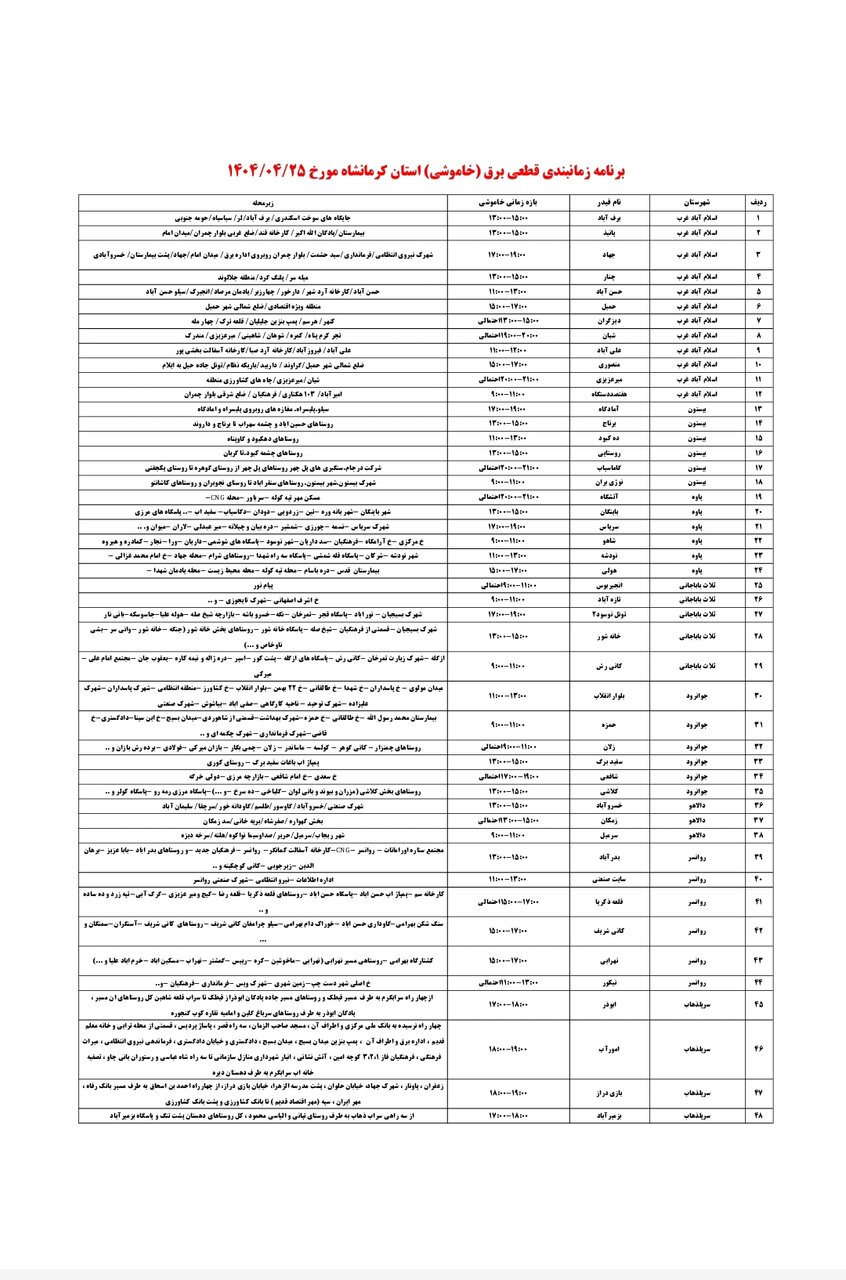 شرکت توزیع برق استان کرمانشاه طی جدولی، زمانبندی قطعی برق در مناطق مختلف استان کرمانشاه را برای امروز _چهارشنبه بیستوپنجم تیر_ اعلام کرد.