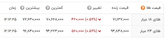 در بازار نرخ هر گرم طلای 18 عیار با 42 هزار تومان کاهش و با نرخ هفت میلیون و 113 هزار تومان در بازار طلا معامله شد. سکه امامی با 700 هزار تومان کاهش به 79 میلیون و 485 هزار تومان قیمت گذاری شد. سکه بهار آزادی با 20 هزار تومان کاهش به 72 میلیون و 295 تومان رسید. نرخ نیم سکه و ربع سکه به ترتیب 42 میلیون و 800 هزار تومان و 25 میلیون و 400 هزار تومان در تابلو اعلان قیمتها نمایان شد.