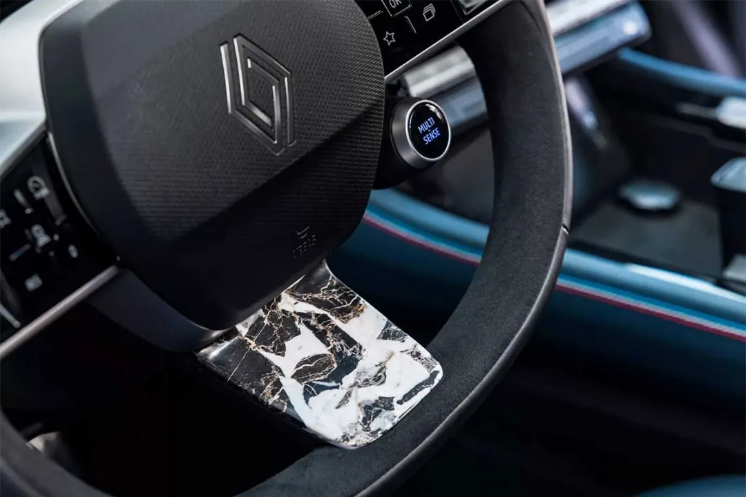 رنگ بدنه با افکت درخشان سهرنگ، جلوهای باشکوه به خودرو بخشیده و آن را از نمونههای معمولی متمایز کرده است. کابین این خودرو مملو از جزئیات سفارشی است که بیشتر به رولزرویس فانتوم شباهت دارد تا یک رنو رافال معمولی. یکی از ویژگیهای برجسته کابین، استفاده از مرمر سیاه است که از معادن کوههای پیرنه استخراج شده است. این مرمر با دقت توسط شرکت مینرال اکسپرتیز انتخاب و در نقاطی مانند کنسول مرکزی عقب، شاخه پایینی فرمان و داشبورد به کار رفته است. این تزئینات مرمرین، جلوهای لوکس و غیرمعمول به کابین بخشیدهاند.