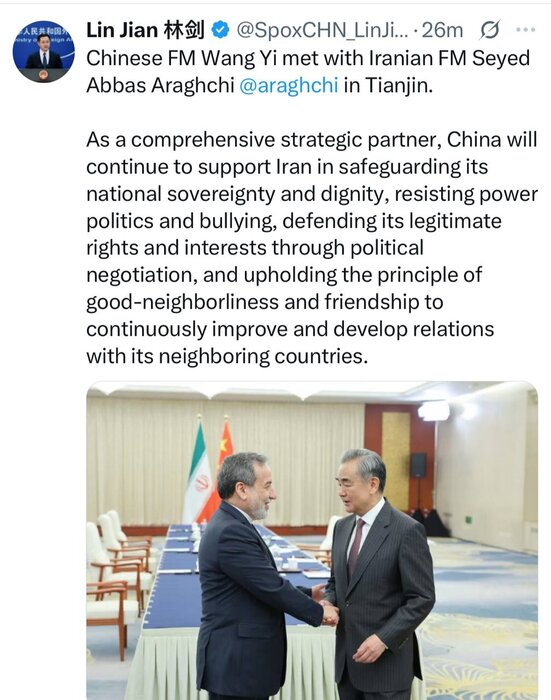 سخنگوی وزارت خارجه چین در حساب کاربری خود در شبکه ایکس در این باره نوشت: وزیر امور خارجه چین، وانگ یی، در شهر تیانجین با وزیر امور خارجه ایران، سید عباس عراقچی، دیدار کرد.