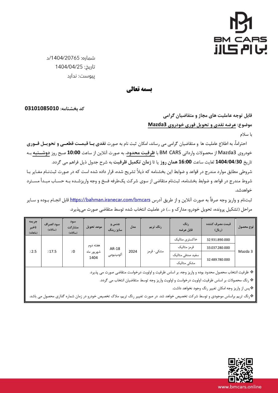 در حال حاضر نشان بی ام کارز گروه بهمن این عرضه را خارج سامانه برنامه ریزی کرده است. شرکت بی ام کارز که یکی از زیر مجموعه های گروه بهمن به شمار می رود چندی پیش از برگ برنده خود در بخش واردات رونمایی کرد و این برگ برنده چیزی نبود جز مزدا ۳ جدید که بسیاری از علاقه مندان به حوزه خودرو انتظار آن را می کشیدند. مزدا ۳ جدید از چندین جهت برای گروه بهمن حائز اهمیت است که یکی از جنبه های آن حضور محصولی جذاب غیر چینی در سبد محصولات این شرکت است. مورد دیگر آن است که گروه بهمن در گذشته عرضه و مونتاژ محصولات مزدا را بر عهده داشته و اکنون واردات و عرضه جدید توسط این شرکت، این پیام را می رساند که مزدا به خانه برگشته است. از طرفی وجود همین دلایل باعث شد که قیمت درب کارخانه این سدان ژاپنی بی ام کارز در عرضه اولیه قیمتی پایین تر از رقبا داشته باشد. بر اساس گزارش پایگاه خبری آخرین خودرو، در این شرایط فروش، سدان ژاپنی بی ام کارز قرار است در رنگ های قرمز، مشکی، خاکستری و سفید عرضه شود که قیمت درب کارخانه آنها براساس رنگ بدنه بین ۳۲,۴۸۹,۷۸۰,۰۰۰ ریال تا ۳۳,۰۳۷,۲۸۰,۰۰۰ ریال خواهد بود. لازم به ذکر است که موعد تحویل BM Cars در این شرایط فروش، هفته دوم شهریور ماه ۱۴۰۴ خواهد بود و جریمه تاخیر به صورت ماهانه ۲.۵ درصد اعلام شده است. متقاضیانی که قصد دارند در این طرح شرکت کنند می بایست از ساعت ۱۰ صبح روز دوشنبه ۳۰ تیرماه ۱۴۰۴ تا ساعت ۱۶ همان روز و یا تا زمان تکمیل ظرفیت با مراجعه به وبسایت رسمی فروش محصولات بی ام کارز نسبت به ثبت نام و واریز وجه اقدام نمایند.