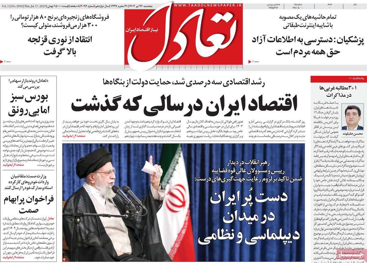 صفحه اول روزنامه تعادل پنجشنبه ۲۶ تیر