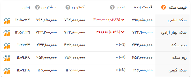 به گزارش آخرین خبر و تا لحظه تنظیم این خبر؛ سکه امامی با افت 300 هزار تومانی قیمت، 79 میلیون و 505 هزار تومان ارزش گذاری شد. سکه طرح قدیم نیز با کاهش 30 هزار تومانی قیمت، 72 میلیون و 290 هزار تومان به فروش می رسد.