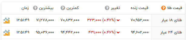 هر گرم طلای 18 عیار نیز با کاهش 32 هزار و 300 تومانی قیمت، 7 میلیون و 95 هزار و 200 تومان در طلافروشی ها خرید و فروش می شود.