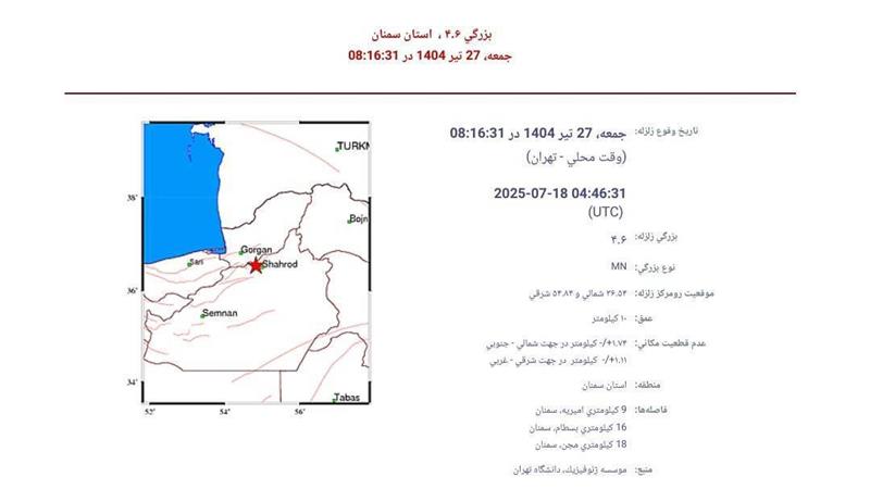 این زمین لرزه ساعت ۸ و ۱۶ دقیقه و ۳۱ ثانیه امروز در عمق ۱۰ کیلومتری زمین در امیریه مجن واقع در شهرستان شاهرود رخ داد.