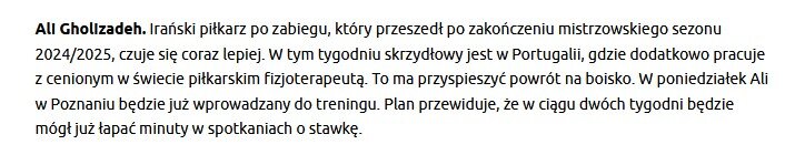 در همین رابطه سایت باشگاه لخ پوزنان در رابطه با آخرین وضعیت قلی زاده برای بازگشت به تمرینات این تیم نوشت: علی قلیزاده بازیکن ایرانی، پس از جراحیای که بعد از پایان فصل انجام داد حالا وضعیت بهتری دارد. این هفته، او در کشور پرتغال حضور دارد و با فیزیوتراپیستی شناختهشده در دنیای فوتبال کار میکند تا روند بازگشتش به میادین سرعت بگیرد. روز دوشنبه، علی در شهر پوزنان به تمرینات تیمی اضافه خواهد شد. طبق برنامهریزیها، او ظرف دو هفته آینده میتواند دقایقی در مسابقات رسمی بازی کند.