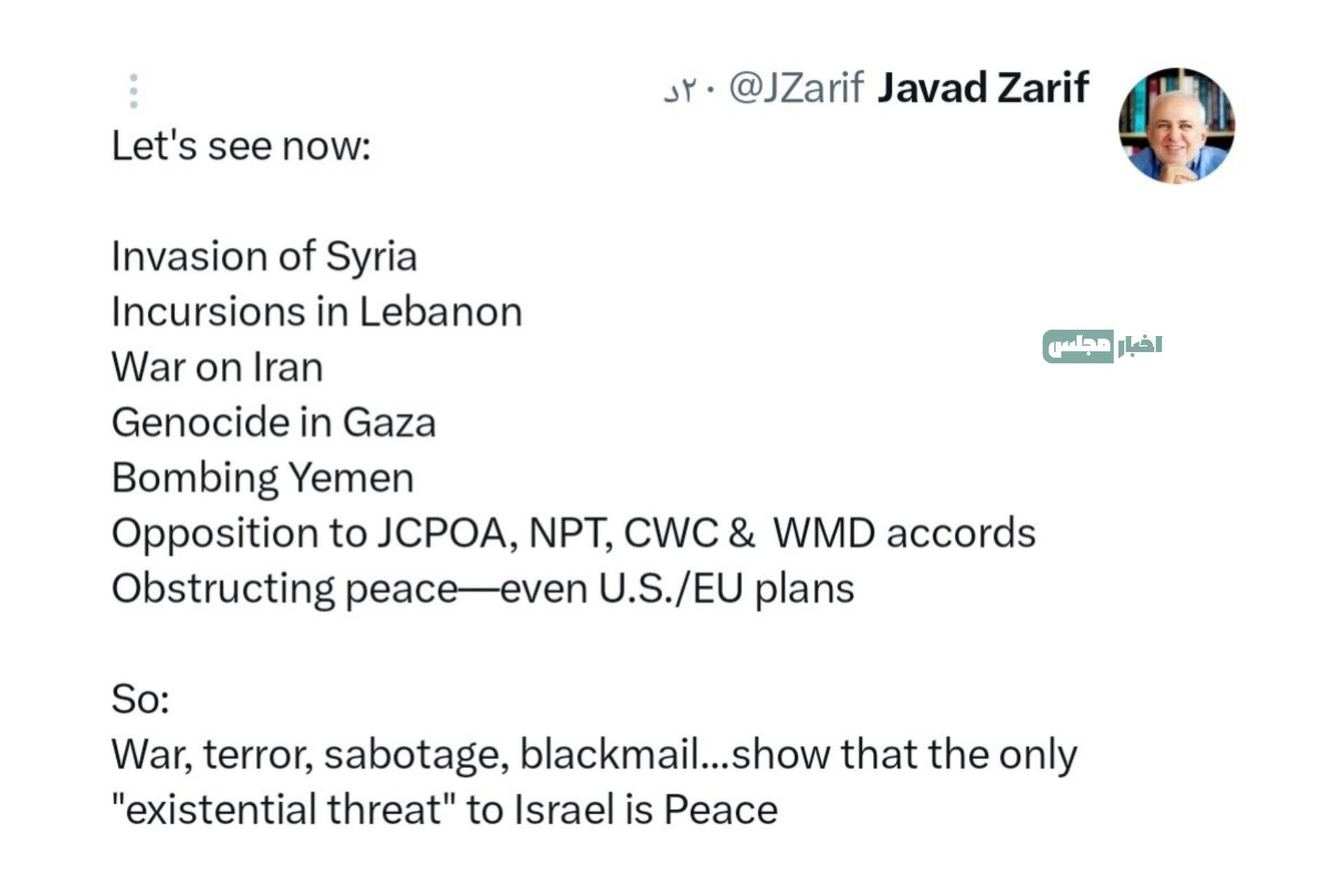 اخبار مجلس/ ظریف نوشت: تهاجم به سوریه، تجاوزات به لبنان،جنگ با ایران،نسلکشی در غزه، بمباران یمن، مخالفت با برجام، NPT، CWC و توافقات سلاحهای کشتار جمعی مانعتراشی در مسیر صلح، حتی برنامههای آمریکا/اتحادیه اروپا