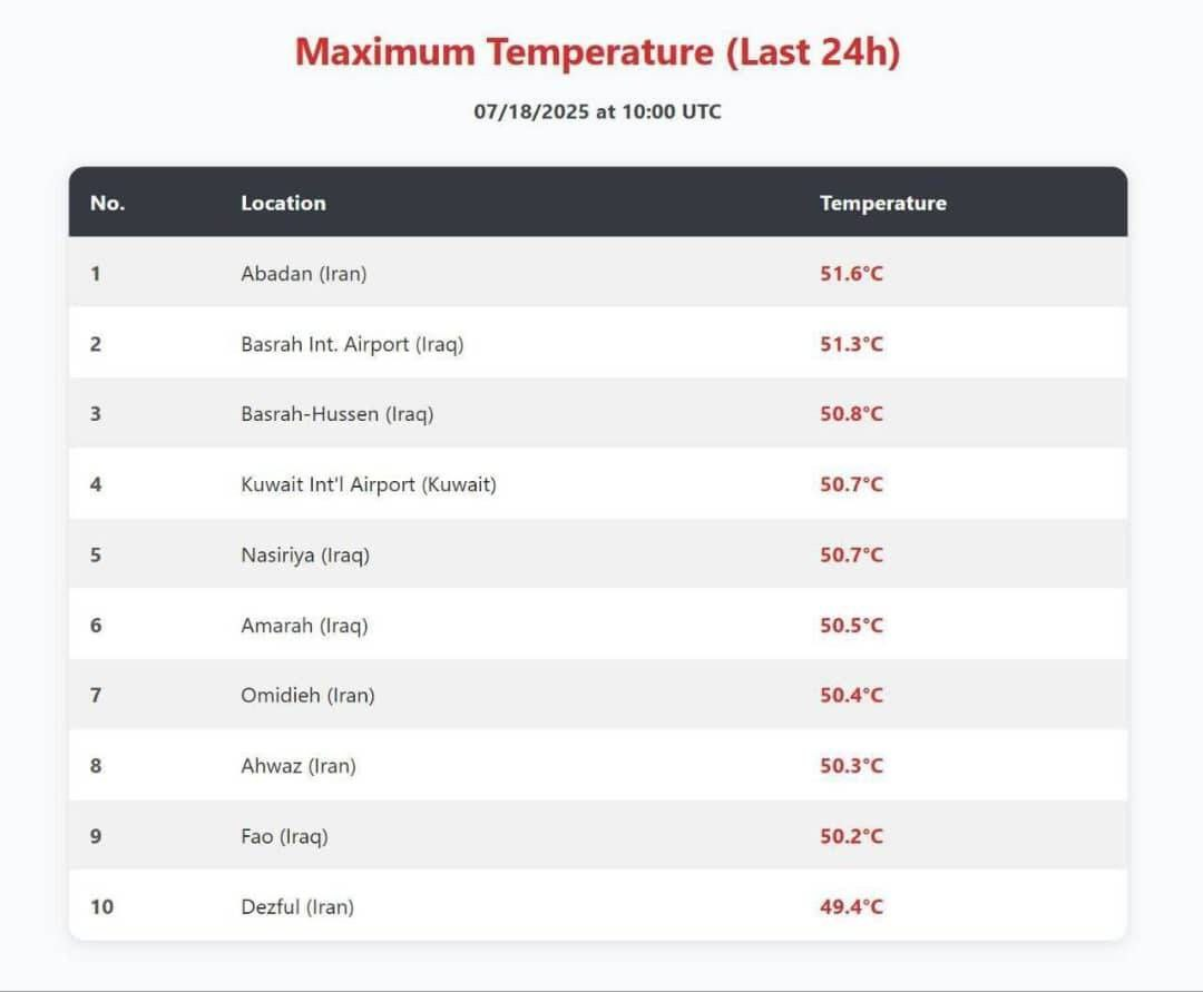امروز شهرهای امیدیه، اهواز و دزفول نیز در جمع ۱۰ شهر گرم جهان قرار گرفتند.