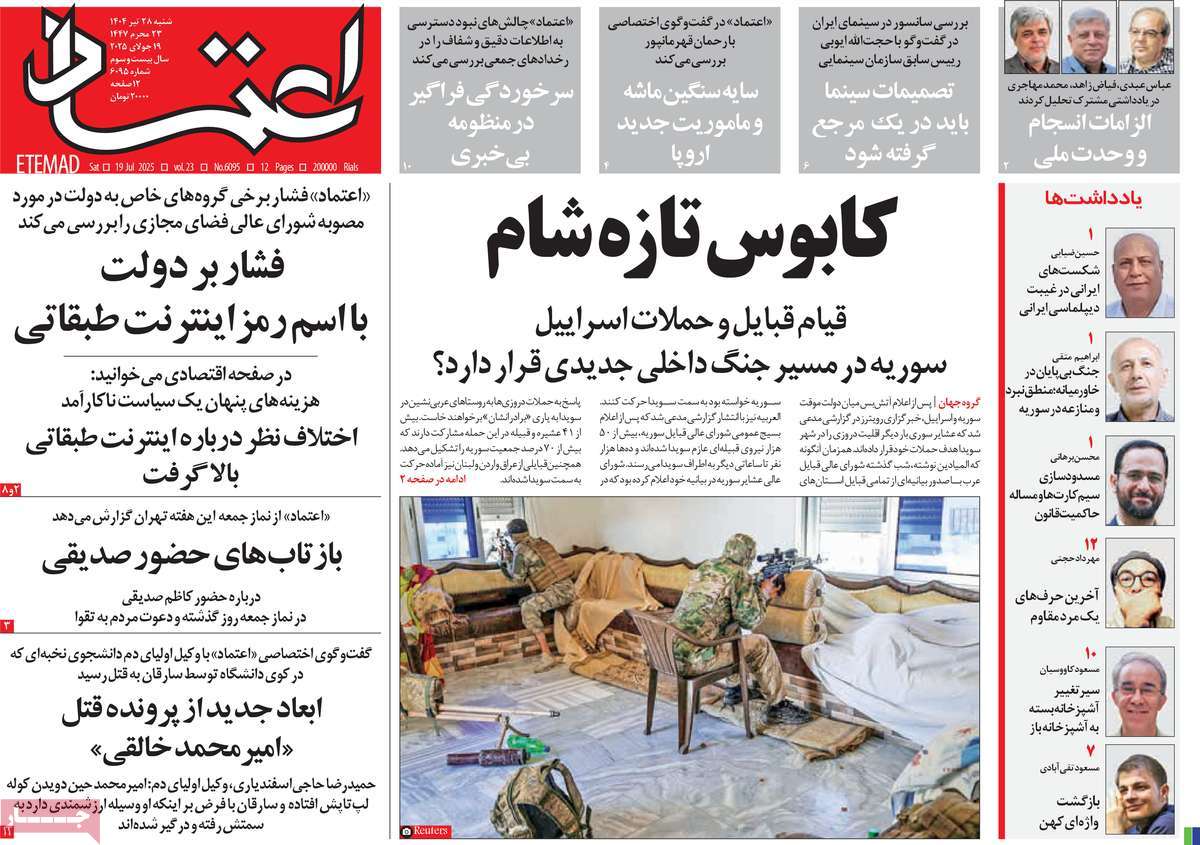 صفحه اول روزنامه اعتماد شنبه ۲۸ تیر