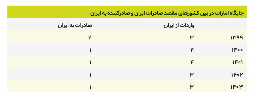 آمارهای رسمی گمرک در سال های اخیر نشان می دهد که امارات در سال های اخیر، نخستین مبدأ واردات کالا به مقصد ایران و یکی از چهار کشور مقصد کالاهای ایرانی بوده است. (جدول زیر به جایگاه امارات در بین کشورهای مقصد صادرات ایران و صادرکننده کالا به ایران پرداخته است). این موضوع، وابستگی بالای ایران به امارات در حوزه تجارت خارجی را نشان می دهد.