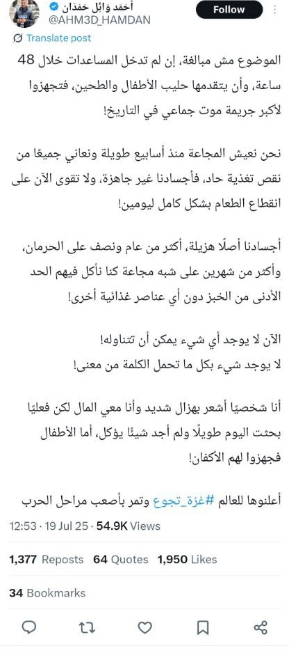 احمد وائل حمدان، خبرنگار فلسطینی، در توییتی تکاندهنده هشدار داد که اگر ظرف ۴۸ ساعت آینده غذا، دارو و آب به غزه نرسد، قتلعامی بیسابقه رخ خواهد داد.