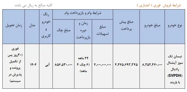 / به اطلاع مشتریان محترم و نمایندگی های مجاز گروه خودروسازی سایپا می رساند، شرایط فروش فوری اعتباری نیسان تک سوز آپشنال رادیال با باربند از ساعت ۱۰ روز سه شنبه مورخه ۱۴۰۴/۰۴/۳۱ از طریق سایت فروش اینترنتی تا زمان تکمیل ظرفیت، طبق مراحل ذیل جاری خواهد شد.