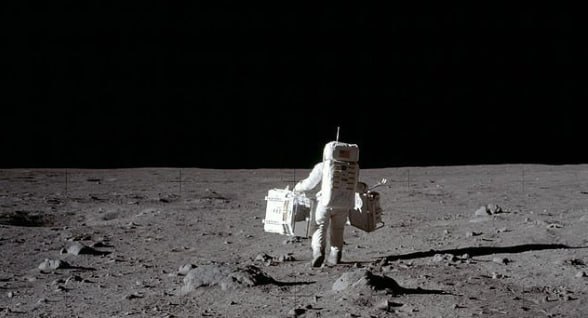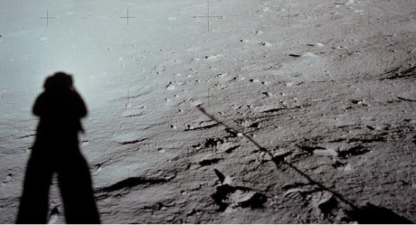 توضیح عکس: نظریه پردازان توطئه این عکس را به عنوان دلیلی بر واقعی نبودن فرود روی ماه گرفته اند زیرا سایه های موجود در تصویر موازی نیستند، اما این در واقع به دلیل پرسپکتیو است.