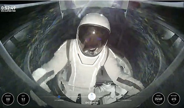 اما بزرگترین آزمایش: زمانی که فرمانده ماموریت جرد ایزاکمن و متخصص ماموریت سارا گیلیس با لباس هایی که قبلاً هرگز در فضا آزمایش نشده بود به بیرون از خدمه دراگون رفتند.