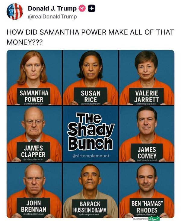 در این پست آمده است که «سامانتا پاور چطور این همه پول به دست آورد؟؟؟» سامانتا پاور از سال ۲۰۲۱ بهعنوان مدیر آژانس توسعه بینالمللی ایالات متحده (USAID) فعالیت میکرد. ترامپ در دولت دوم خود این آژانس را منحل کرد و حالا با انتشار عکس او به همراه اوباما در لباس زندان، منبع ثروت پاور و نقش اوباما در این ثروتاندوزی را زیر سؤال برده است.
