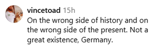 فرد دیگری نوشته «آلمان همیشه در سمت اشتباه تاریخ ایستاده است.»کاربر دیگری تصریح کرده: «آلمان در سمت اشتباه تاریخ ایستاده است. در سمت اشتباه تاریخ و سمت اشتباه زمان حال. آلمان! این، زندگی چندان شرافتمندانهای نیست.»