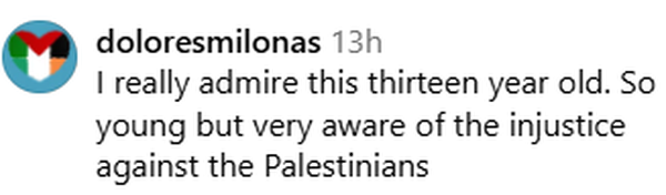 یکی از کاربران با تمجید از این دختر نوجوان تأکید کرده که «او با وجود سن بسیار کم، بهخوبی از بیعدالتی علیه فلسطینیها آگاه است.»