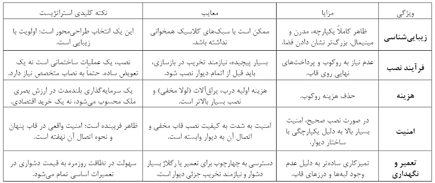 ⏺ محدودیت در انواع دیوار: اجرای آن در دیوارهای باربر بتنی یا سنگی بسیار دشوارتر از دیوارهای کناف یا آجری است.