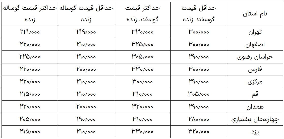 در جدول زیر قیمت دام زنده در استانهای مختلف کشور قابل مشاهده است.