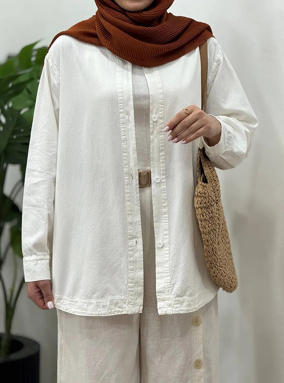 ⏺ شومیز دکمهدار ساده (Classic Button-Down): از پارچههای نخی، کتان یا ویسکوز. بهترین گزینه برای زیر مانتوهای رسمیتر و ایجاد ظاهری مرتب. رنگهای سفید، کرم، آبی آسمانی و چهارخانه ریز بسیار پرطرفدارند.