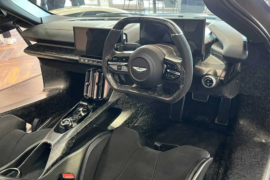 این خودرو اولین محصول پلاگینهیبریدی آستونمارتین، اولین سوپراسپرت تولیدی موتور وسط و اولین مدلی است که قابلیت پیمایش تمام الکتریکی دارد. آیرودینامیک فعال، سیستم DRS و داونفورس بیش از 590 کیلوگرم در سرعت 240 کیلومتر بر ساعت، این خودرو را در پیچها کاملاً پایدار نگه میدارد. با ورود به کابین والهالا، بلافاصله متوجه میشوید که این خودرو برای مسابقه طراحی شده است. کابین نمونهای از طراحی هدفمند است و فیبر کربن نهتنها برای کاهش وزن، بلکه برای القای حس یک ابرخودروی منحصربهفرد بهکار رفته است. یک میله فیبر کربنی ضخیم در سراسر داشبورد کشیده شده که هم حس استحکام را منتقل میکند و هم ظاهری بسیار جذاب دارد. فرمان مستطیلی مشابه خودروهای فرمول یک، مجهز به کنترلهای فیزیکی است تا راننده بدون نیاز به گشتن در منوها، تمرکز خود را حفظ کند. پشت فرمان، یک نمایشگر دیجیتال 10 اینچی روی ستون قرار دارد که بسته به حالتهای مختلف رانندگی تغییر میکند. طراحی کابین نیز هوشمند و کاملاً راننده محور است.
