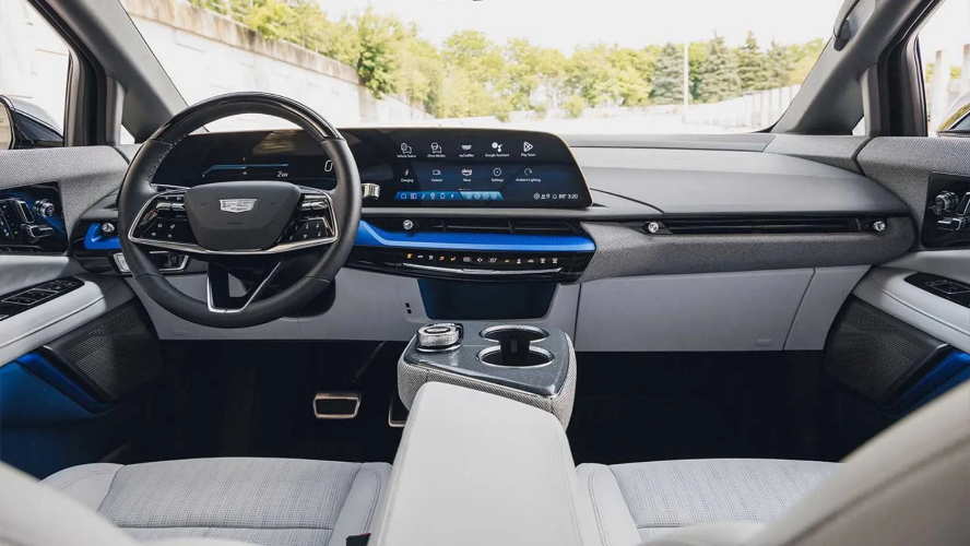 این خودرو همچنین مجهز به کمکفنرهای Passive Plus کادیلاک است که از سوپاپ دوم بهره میبرند و پاسخ آنها به فرکانس بستگی دارد. این یعنی کمکفنرها در سرعتهای پایین سفتتر میمانند اما در برخورد با ناهمواریهای بزرگ نرمتر میشوند. این سیستم واقعاً کارآمد است زیرا در پیچها حس اسپرت دارد و در مسیرهای ناهموار بهخوبی عمل میکند. فاصله محوری طولانی، کابین اپتیک را به فضایی راحت برای سرنشینان تبدیل کرده است. فضای کافی در هر دو ردیف وجود دارد و تزئینات داخلی شگفتانگیز هستند. پارچه روی درها و داشبورد که از مواد بازیافتی ساخته شده، لوکس به نظر میرسد. یک صفحهنمایش 33 اینچی مشابه آنچه در لیریک دیدهایم، در مقابل راننده قرار دارد و دریچههای تهویه به زیبایی در زیر آن تعبیه شدهاند. بااینحال، طراحی کشیده و سقف شیبدار عقب، کمی از فضای بار کاسته است. بااینوجود، 736 لیتر فضا در این کلاس قابلقبول است. کادیلاک پورت شارژ را در گلگیر جلو قرار داده تا فضای بار عقب حفظ شود، هرچند این به قیمت نبود صندوق بار جلو تمام شده است.